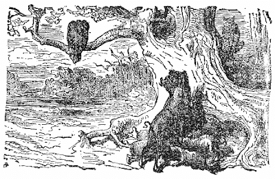 The people ran out in crowds to laugh at the sight; till the Donkey, not liking the noise nor his situation, kicked asunder the cords and, tumbling off the pole, fell into the river.
